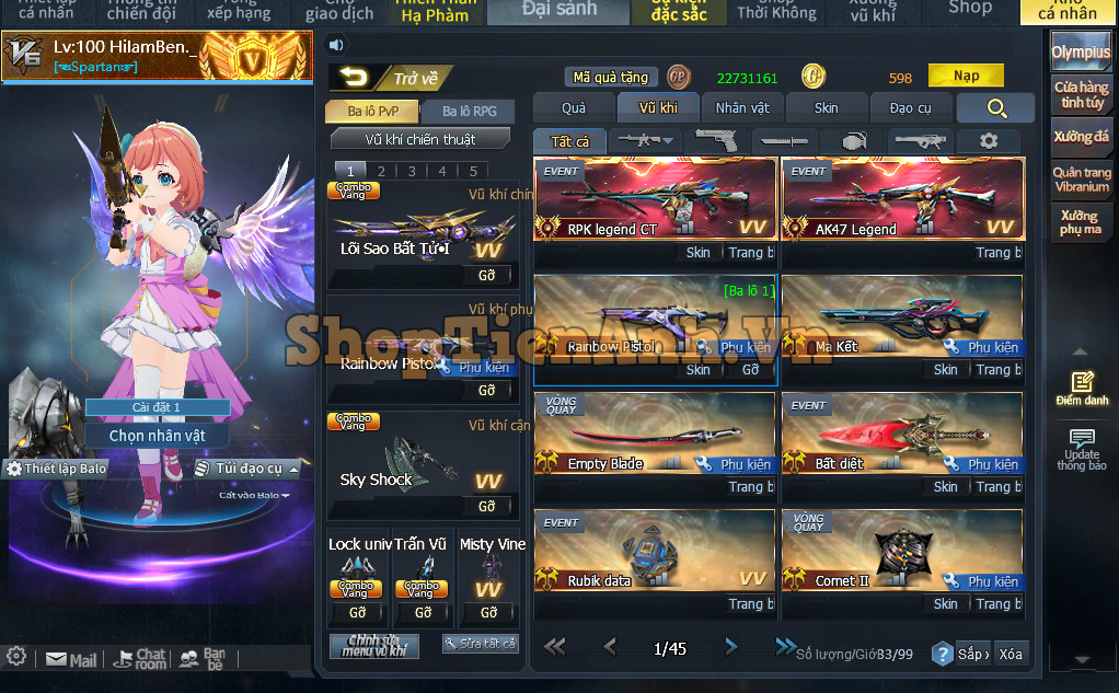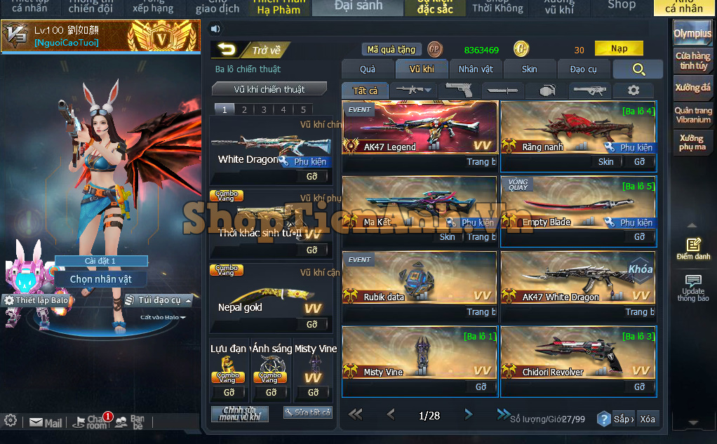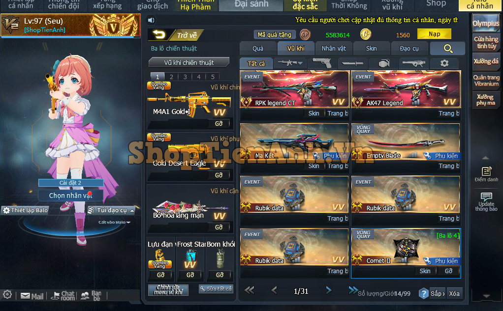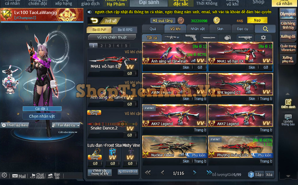 Acc có: M4 white+skill, răng nanh full phụ kiện,Nỏ tận thế zin...