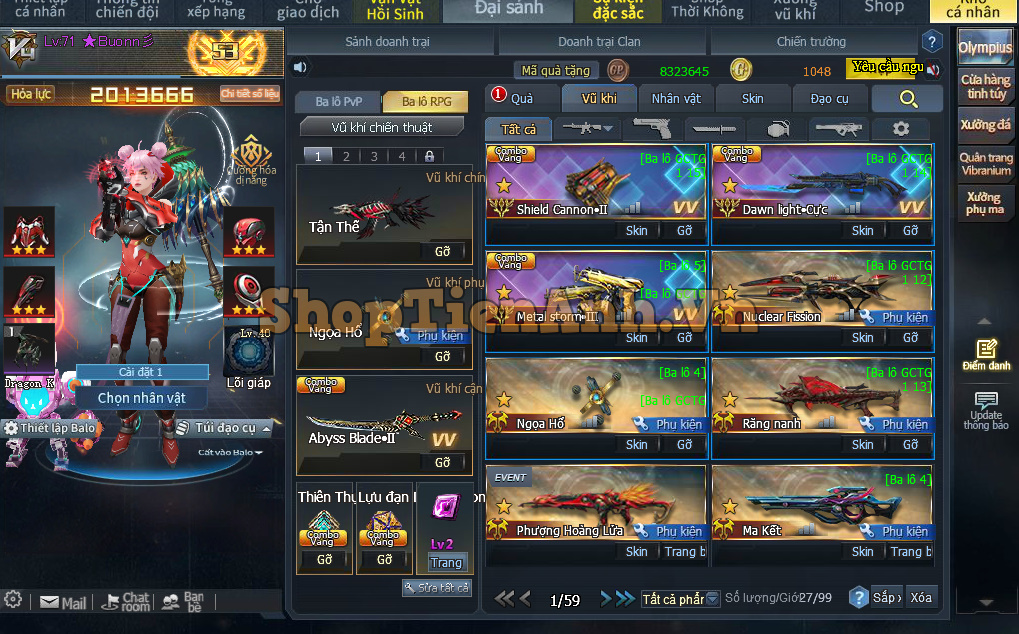 Acc có: Con hàng v8 quá đẹp cho Ae chơi pvp và C4 có m4 skill gold hoàng gia..Rpg 1m4 lc..chơi zôm cũng ok có ngọa hổ+răng nanh full phụ kiện.
