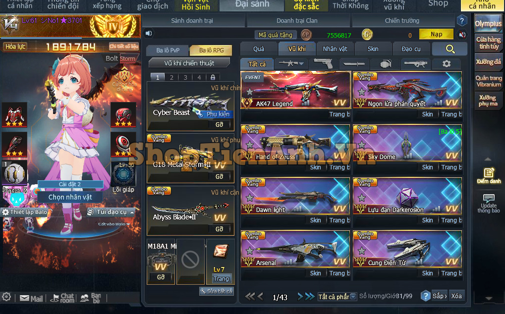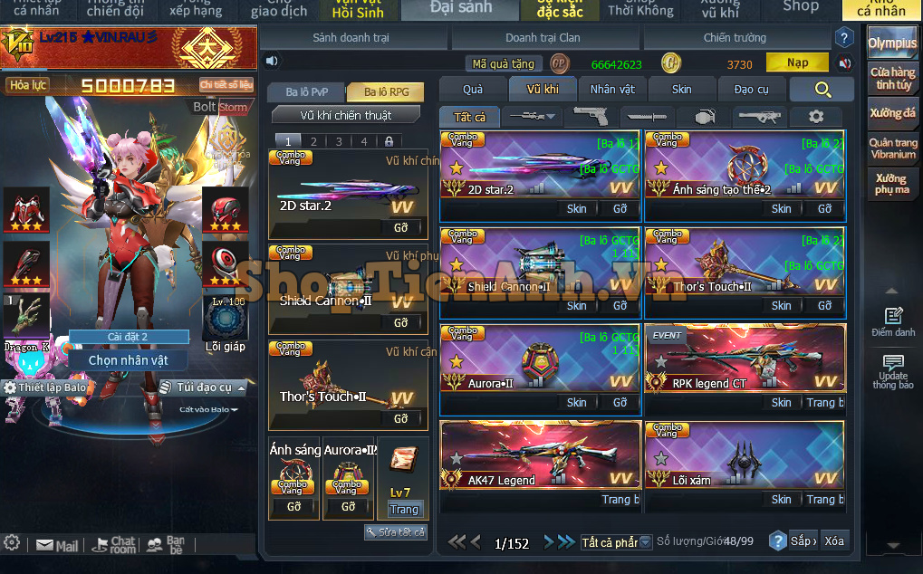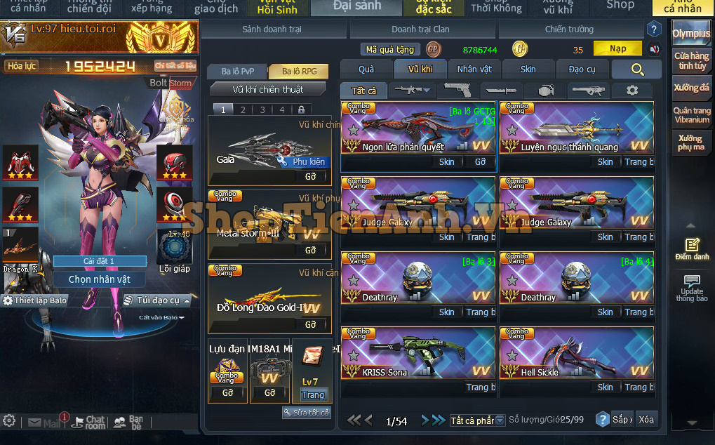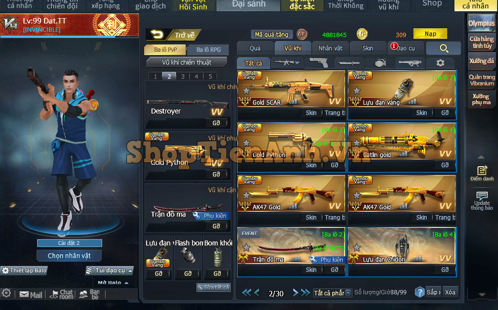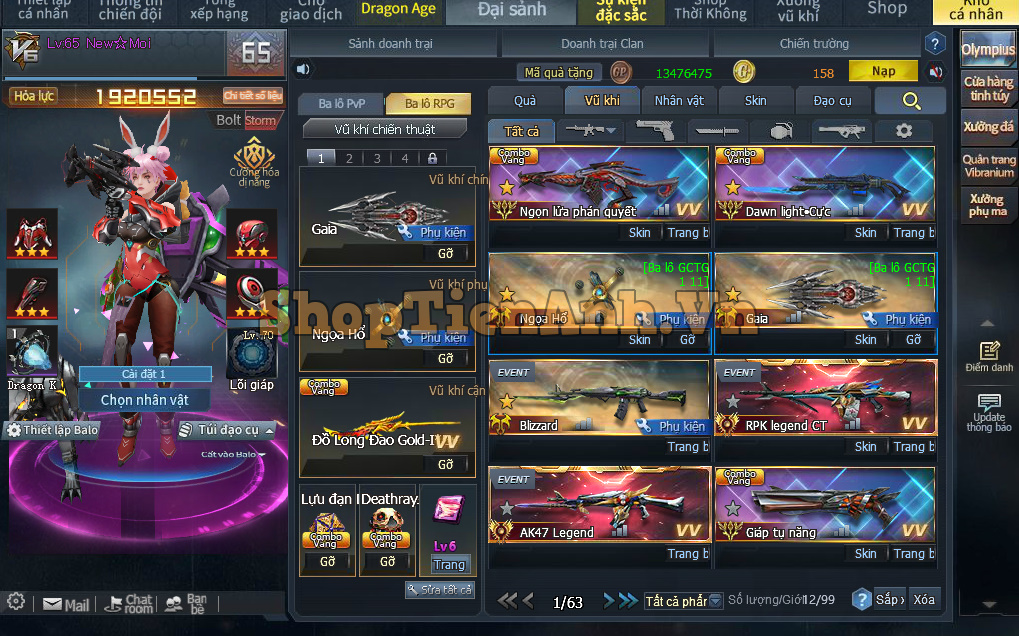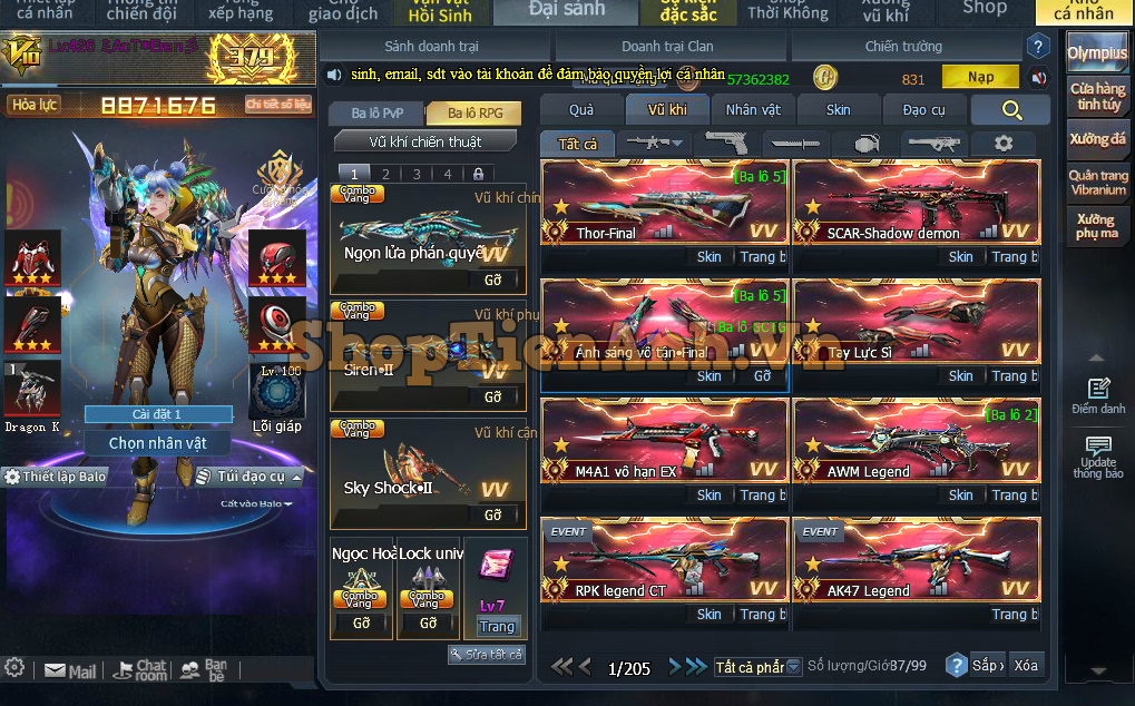 Acc có: Siêu Phẩm cân all chế độ Rpg gần 9m lực chiến, Rồng đá đỏ,2D max và nhiều vũ khí mới đồng bộ max..Ma đồng full bộ đỏ và bộ chip ngon..Đồ chơi pvp không thiếu gì full skill gold hoàng gia.