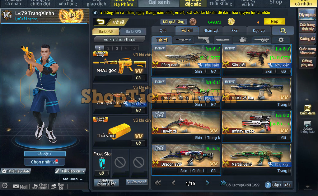 Acc có: Siêu Phẩm Miền Nam cân all chế độ RPG gần 7m lực chiến đồng bộ 2D max,rìu max..Nhân vật Ma Đồng full bộ đỏ..full bộ sưu tập vũ khí kim cương 2025..Đáng để Ae đầu tư đua top.